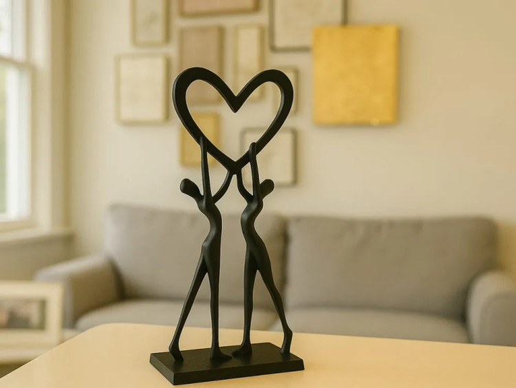 این مجسمه زیبا و مینیمال، تصویری نمادین از دو انسان است که دستانشان را بههم رساندهاند و فرم دلانگیز یک قلب را ساختهاند؛ سمبلی از عشق، همراهی و اتحاد. خطوط کشیده و ظریف، فرم روان و استایل انتزاعی، جلوهای مدرن و شیک به این قطعه داده است. حضور آن روی میز، شلف یا کنسول، فوراً حس گرما و صمیمیت را وارد فضا میکند. رنگ تیره و یکدست مجسمه، ترکیبی جذاب با هر سبک دکوراسیون ایجاد میکند و باعث میشود این اثر هنری، نقطه توجهی آرامشبخش و چشمنواز باشد. طراحی ساده اما تأثیرگذار آن، بیانگر عشقی بیزمان است؛ عشقی که در سینۀ هر خانهای زیبا جلوه میکند.