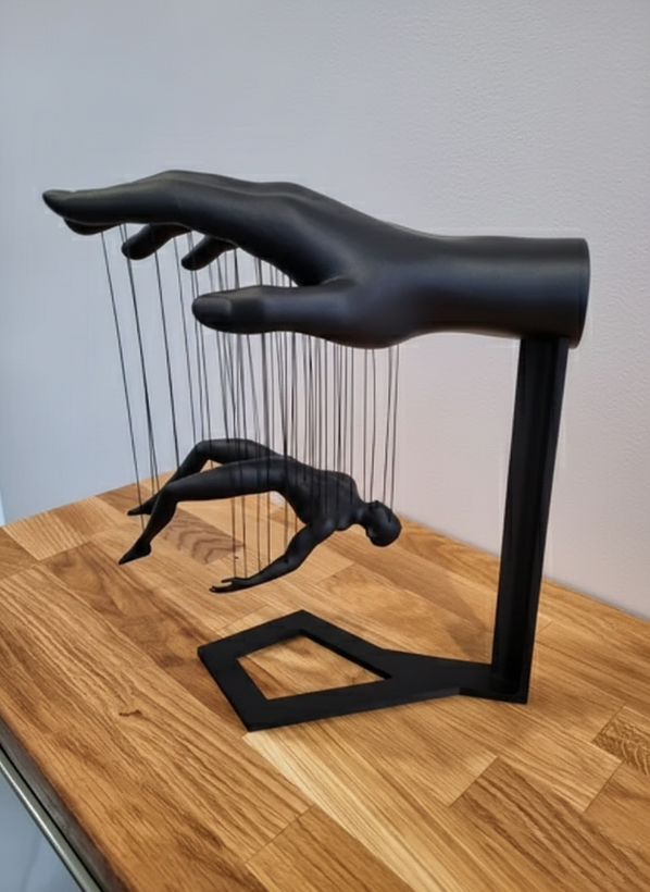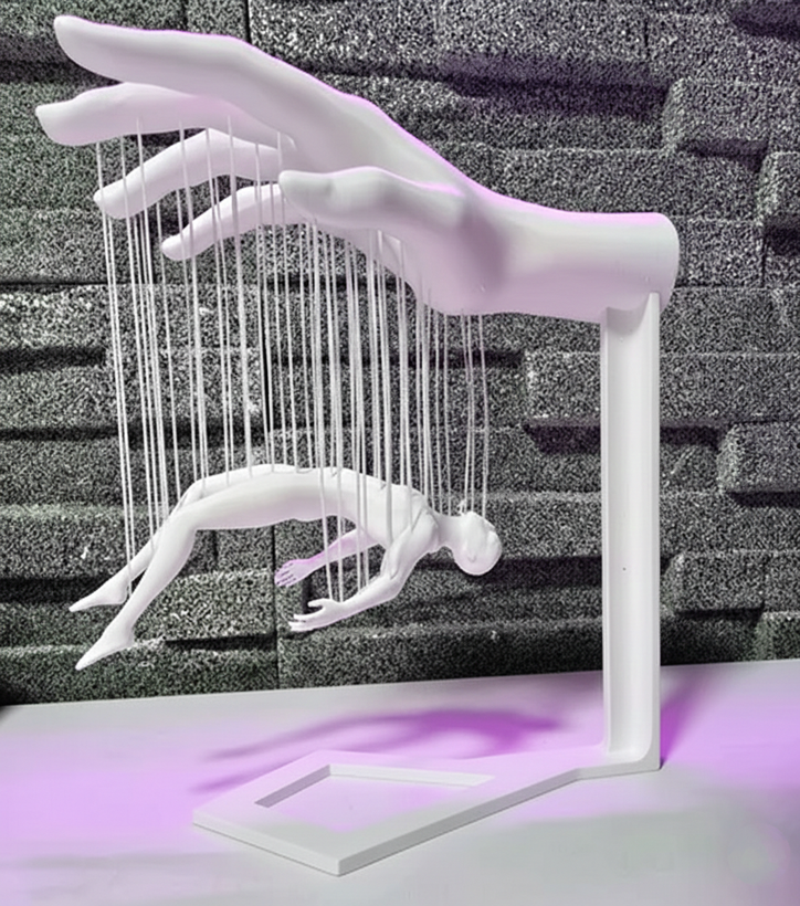 مجسمه «Overtaken» یک قطعه هنری چشمنواز است که نگاه را به خود خیره میکند. این اثر ظریف و مجذوبکننده، دست را در حال نگهداشتن انسانی کوچک در میان رشتههای نازک و معلق نشان میدهد؛ ترکیبی که حس تعادل و انتقال انرژی را به بیننده القا میکند. طراحی پویا و خطوط ملایم، این مجسمه را برای فضای منزل، دفتر کار یا گالری به انتخابی برجسته تبدیل میکند. سطح صاف، جزئیات قابلتوجه و فرم هنرمندانه، با هر زاویه دید زیبایی تازهای را آشکار میسازد و توجه هر بینندهای را جذب میکند.